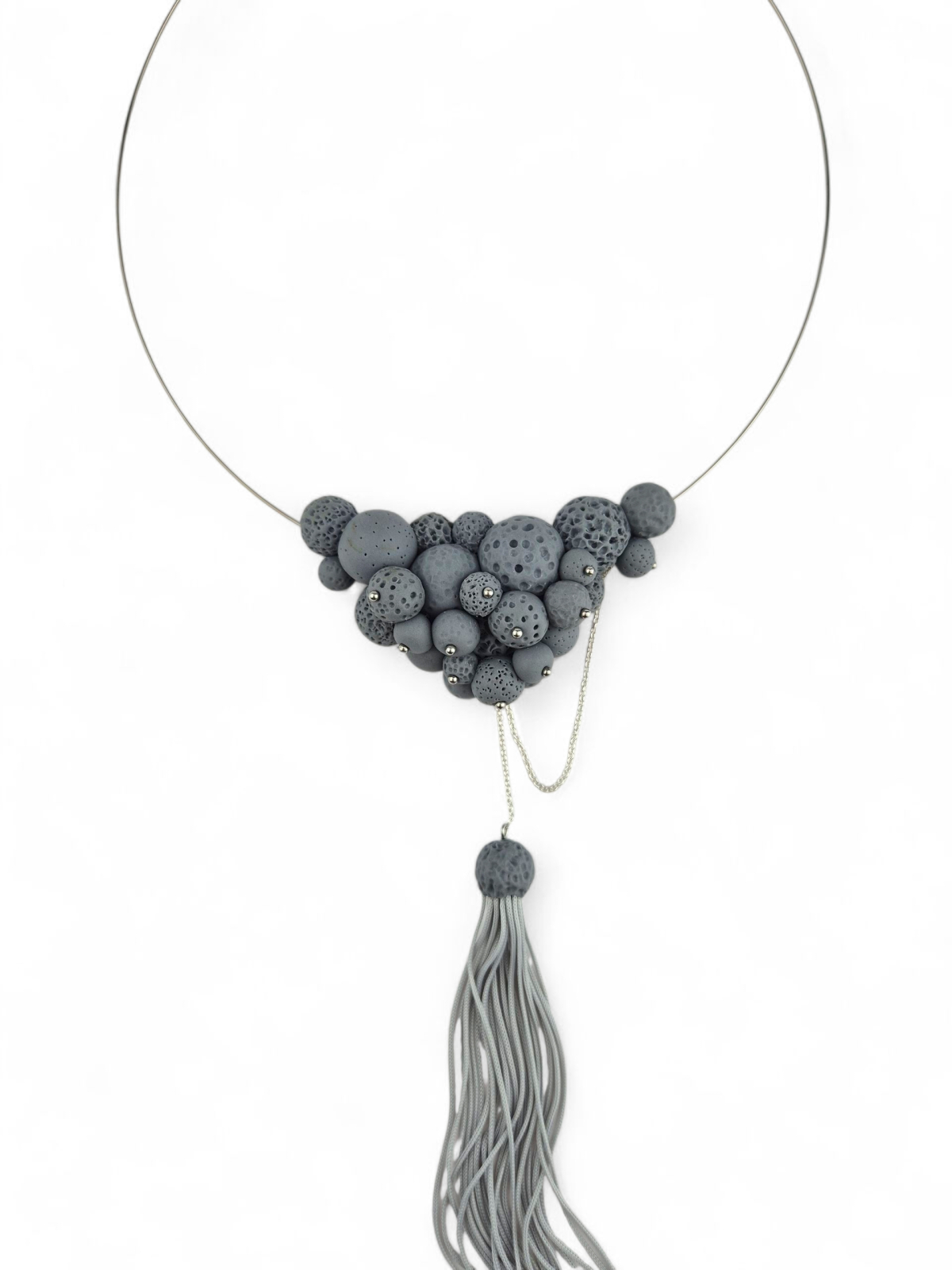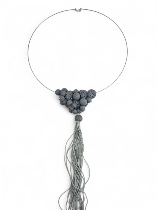 Colierul Stormy Gray Spheres este o piesă statement cu un limbaj sculptural contemporan, construită din volume sferice, în nuanțe stratificate de gri. Texturile mate și poroase creează un contrast subtil între suprafețe, oferind profunzime vizuală și o prezență puternică, dar echilibrată.