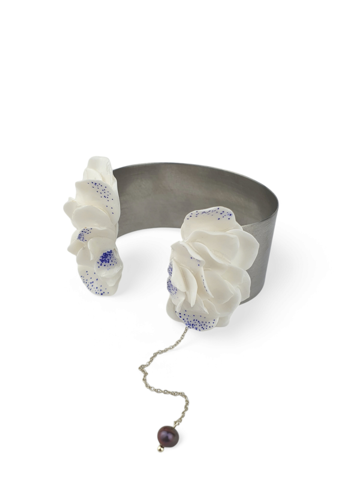 Piesa Flower Cuff este o brățară statement, delicată, dar vizibilă, cu o compoziție inedită de petale albe modelate pe o manșetă metalică. Esenta sa este aerul feminin dat de contrastul subtil dintre splash-ul albastru și lănțișorul fin din inox. Această piesă adaugă instantaneu rafinament și originalitate.