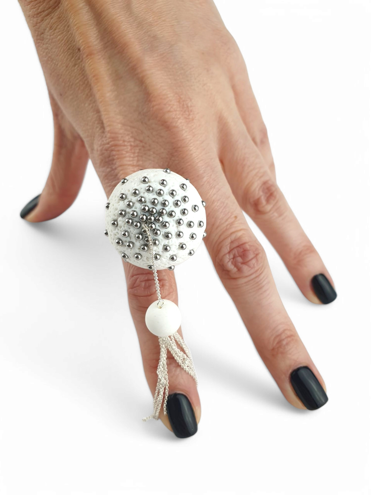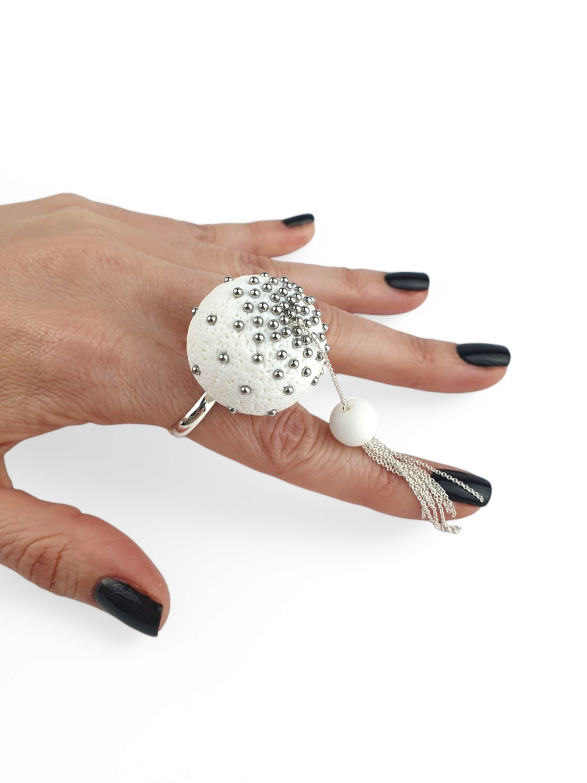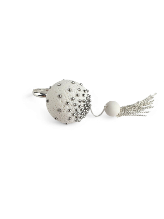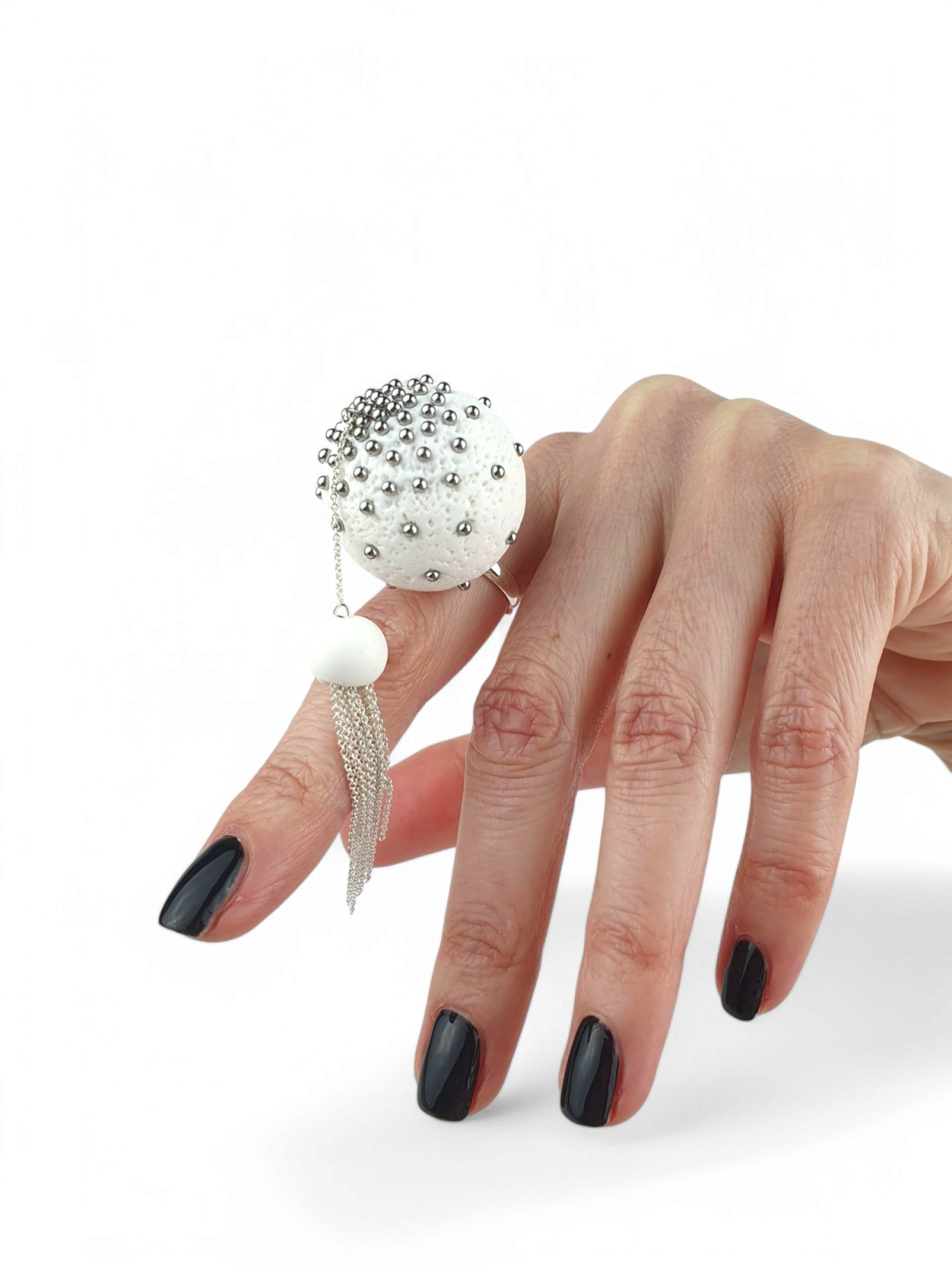 Muse Chains este un inel statement de bijuterie contemporană, conceput ca un obiect sculptural purtabil. Piesa este o sferă din rășină mată, poroasă, cu o textură tactilă distinctă, accentuată de elemente metalice și lanțuri fine din argint.